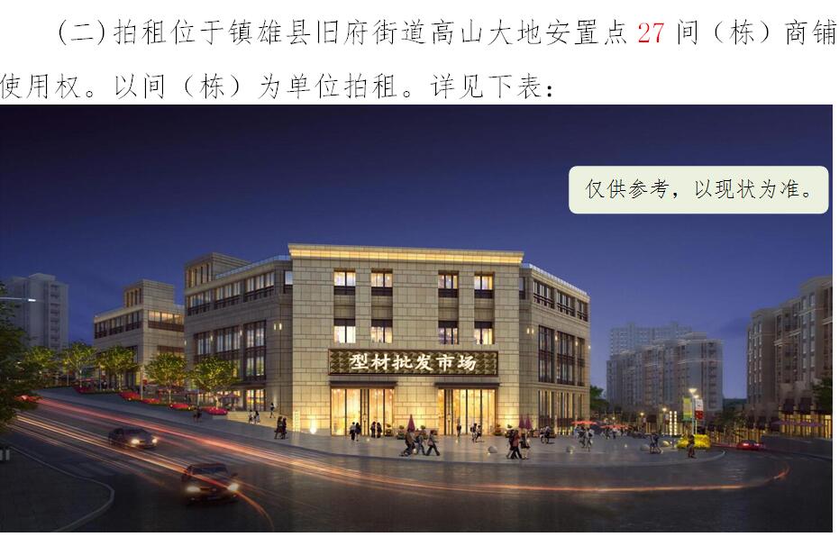 經(jīng)鎮(zhèn)雄縣人民政府批準(zhǔn),受相關(guān)部門(政府)委托,公開拍租位于鎮(zhèn)雄縣易地扶貧搬遷工程呢嚕坪安置點7棟獨立商鋪使用權(quán)、高山大地安置點27間(棟)商鋪使用權(quán)、魯家院子安置點24間(棟)商鋪使用權(quán)、母享安置點146間商鋪使用權(quán)、以勒物流城安置點67間(棟)商鋪使用權(quán)、碗廠安置點114間商鋪使用權(quán)。相關(guān)事項如下:
